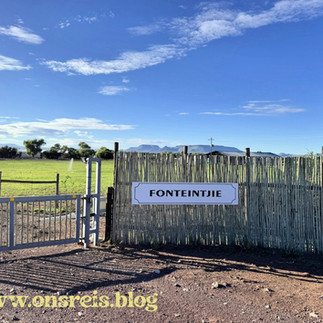 ‘n Paar kilometer verby Steynsburg is die bekende Teebus en Koffiebus koppies in die verte sigbaar. Net voor Teebus draai ons af na die plaas, Fonteintjie. Ons het gereӫl om op die gras van die gastehuis te kamp vir die nag, en dan sal ons gashere ons die uitloop van die tonnel gaan wys. Die gras om die huis en die kamp langsaan is baie groen. Willemien en Johan boer met skape en mielies. Hulle maak veevoer pille van hulle eie gewasse en is ook die eerste plaas in die lyn wat water uit die skema ontvang.