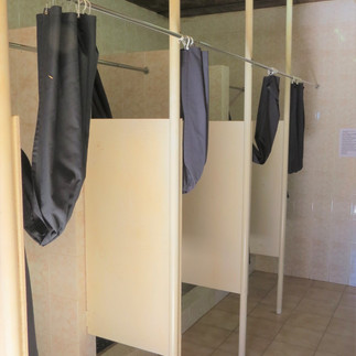 Ons staan naby die ablusies wat skoon en heel skaflik is. Ronel dink hulle kant se gedeelte met die bad kort n behoorlike herstel. By die manne is daar 3 toilette, krippies, 3 wasbakke en 4 storte. Die storte het nie n bankie nie; dus laat jy jou klere maar op die skoon vloer terwyl jy stort.