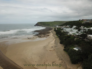 Ons kies die staanplek verste weg van die rivier en die see. ‘n Volle sewentig meter se stap dan was ons op die sand. Mens stap deur die stroompie van die rivier wat jou na ‘n strand lei waar jy ver kan gaan stap in ‘n oostelike rigting. In ‘n westelike rigting is heelwat rotse. Hoewel dit amper heeltyd met ons verblyf reӫn, voel die lugtemperatuur meer soos Natal en minder soos die Kaap.